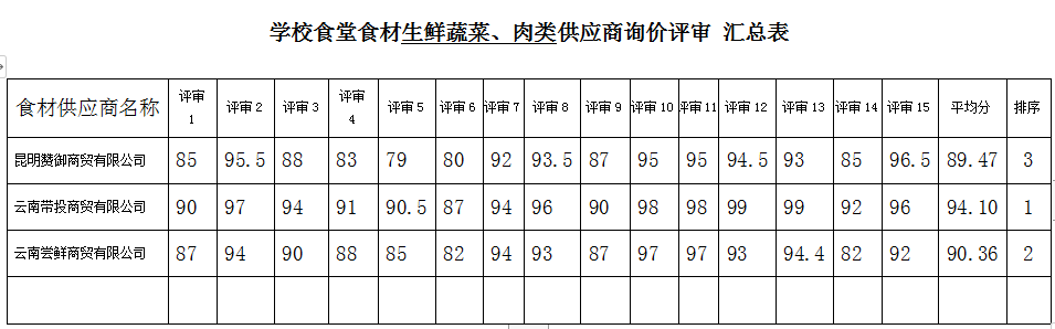 根据《中华人民共和国食品安全法》《中华人民共和国采购法》《学校食堂大宗食材采购验收管理工作指引》《云南东方中医药中等专业学校关于食堂食材询价采购公告》,结合学校食堂食材采购工作安排,2025年12月29日上午通过评审小组对各供应商的资质、报价、产品质量及服务承诺等进行综合评审打分,现将评审结果及评分公示如下: