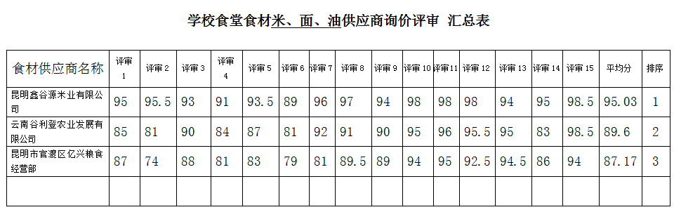 学校食堂食材生鲜蔬菜、肉类采购供应商参与询价的公司共3家;大宗食品米、面、油类采购供应商共3家,具体评分如下: